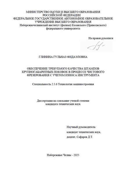Глинина Г.Ф. (2025) Обеспечение требуемого качества штампов крупногабаритных поковок в процессе чистового фрезерования с учетом износа инструмента. Диссертация