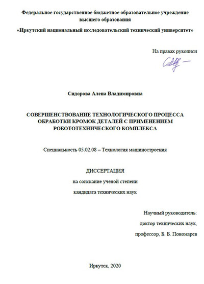 Сидорова А.В. (2020) Совершенствование технологического процесса обработки кромок деталей с применением робототехнического комплекса. Диссертация