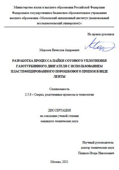 Морозов В.А. (2021) Разработка процесса пайки сотового уплотнения газотурбинного двигателя с использованием пластифицированного порошкового припоя в виде ленты. Диссертация