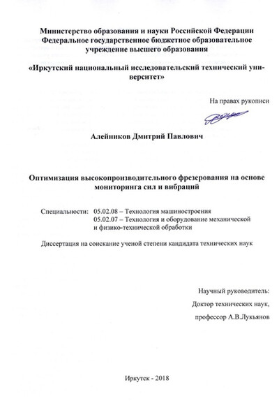 Алейников Д.П. (2018) Оптимизация высокопроизводительного фрезерования на основе мониторинга сил и вибраций. Диссертация