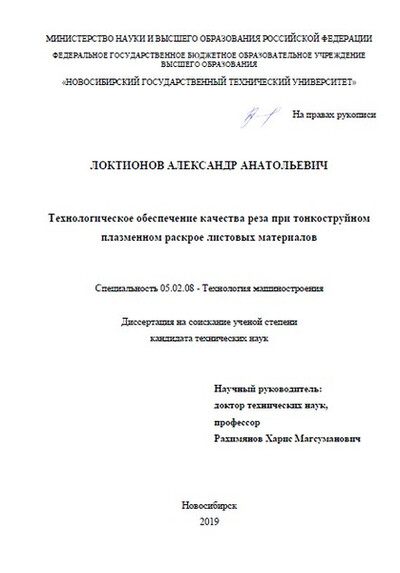 Локтионов А.А. (2019) Технологическое обеспечение качества реза при тонкоструйном плазменном раскрое листовых материалов. Диссертация